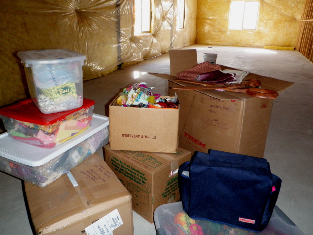 While things on the main level of the house are getting themselves sorted out and put away, this is what the basement and my sewing room look like. This is actually about 1/32 of the boxes and tubs of sewing and crafting goods I brought with me. I hope it feels like Christmas and not like yard sale leftovers when I get to open these boxes again in a few months. Onward, to the next chapter- finishing the basement.