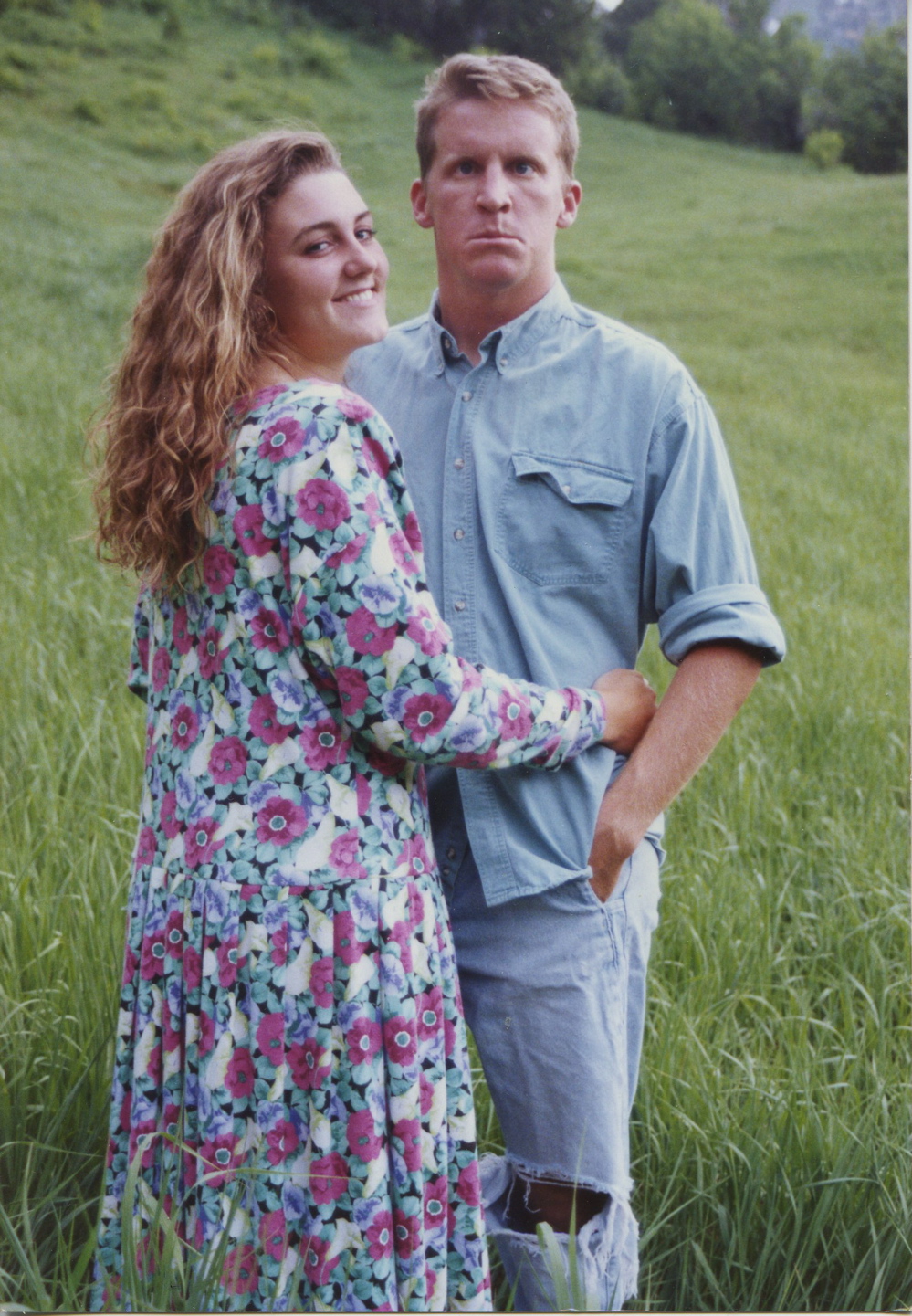 This isn’t our engagement picture, but one from the roll of film shot that day. Can you see why we didn’t use it? This picture says so much, and is wrong for so many reasons- First of all- what is with my dress? It used to be one of my favorites, I wore it all of the time- in this picture I could have weighted 200 lbs. or 100 lbs. (OK, maybe not quite 100 lbs.) and no one would ever know. How am I suppose to gauge how I’m doing 19 years later with a fit like that?