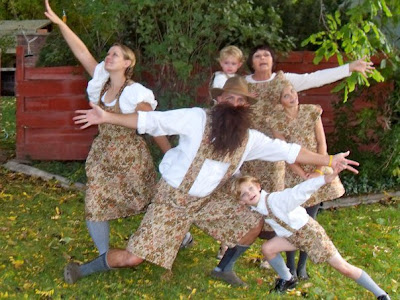 Thinking economically and in a bit of a rush (as I recall now) I didn’t try and match the movie costumes exactly (more of a green fabric) but just went for the goofy upholstery/drapery fabric look. Here we are, all of the Von Trapp children in our winning stage moment- Gretel, Kurt, Marta, Brigitta, Louisa, Friedrich and Liesel, and Captain Von Trapp too. If you remember Gretel has a hurt finger in the movie, the real broken arm on Gretel during our stage moment was a big hit.