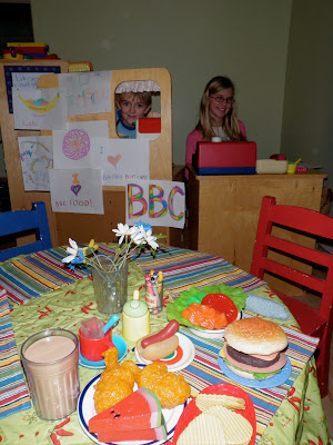 The kids finally have their kitchen back. I built this kitchen in 2002 for Christmas, this isn’t a very good picture of the front side, but the kids insist on keeping it turned to face the wall, and I am just a customer in this picture. We put the play kitchen in storage 2 years ago when we put our Springville house on the market.