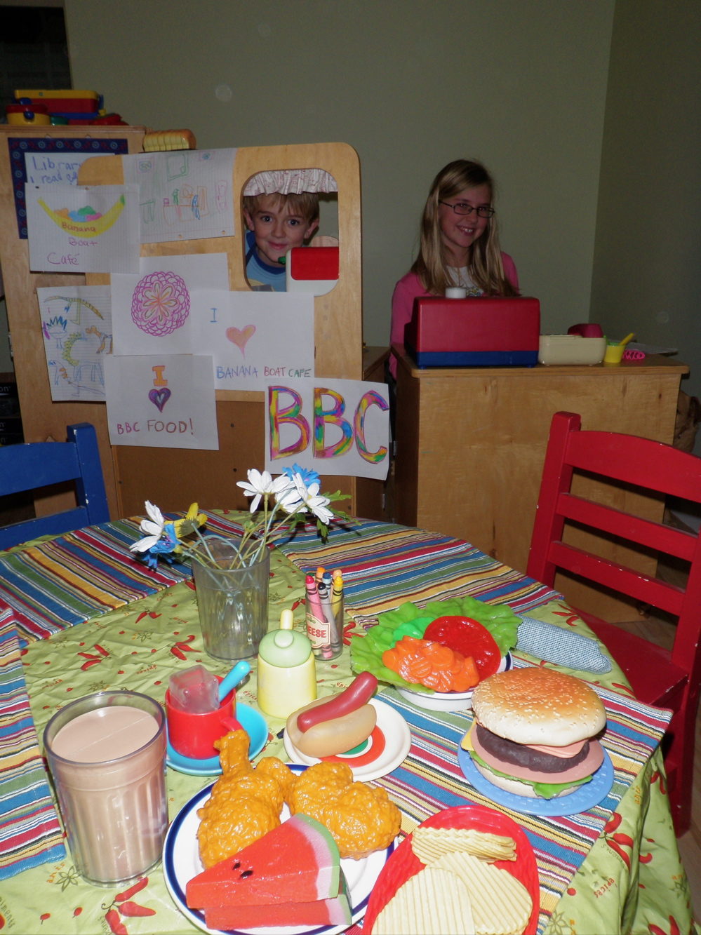 The kids finally have their kitchen back. I built this kitchen in 2002 for Christmas, this isn’t a very good picture of the front side, but the kids insist on keeping it turned to face the wall, and I am just a customer in this picture. We put the play kitchen in storage 2 years ago when we put our Springville house on the market.