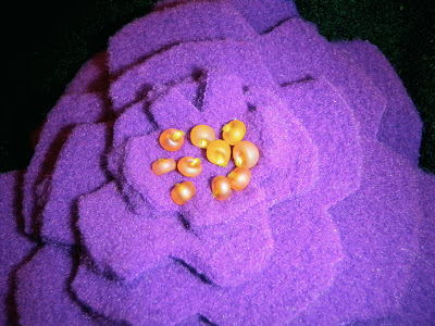 Step 4. With the embroidery floss threaded into the needle, sew the beads into the middle of the flower. With a knot in the end of the thread, begin inside the hat and sew up through all layers of the hat and flower, adding a bead for every stitch. These stitches will sew the flower to the hat and finish the inside of the flower- all in one easy step.