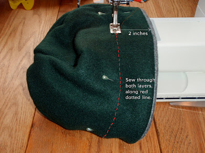 Step 8. Starting in the back, sew through both layers, 2 inches in from the bottom edge of the hat, all the way around.
