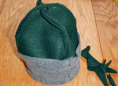 Step 2. Now fold the hat in half length-wise, right sides together, matching the seams where the lining band meets the main hat fabric (green). Open up the green/gray seam flat so that the existing seam will be nice and flat, fewer layers to sew over. Sew along the entire edge, about 1/4 of an inch from the edge. This will be the seam on the very back of the hat.