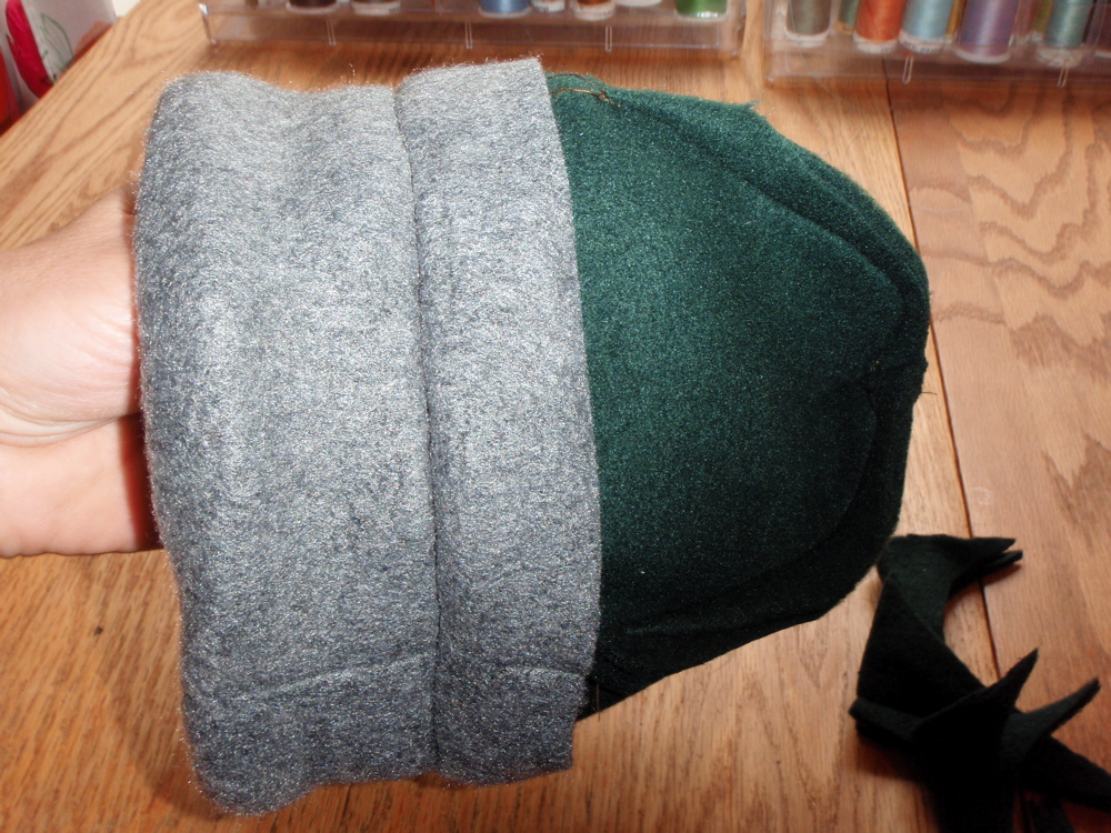 The inside of your hat should look like this. You can choose to trim the lining closer to the seam you’ve just sewn or leave the excess (gray) lining to leave the hat a bit thicker and warmer.