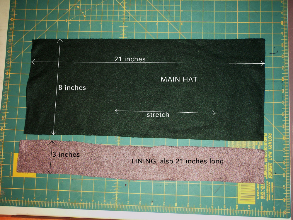 You will need: Two pieces of fleece, the piece for the main body of the hat (shown here as dark green) 21 inches long by 8 inches wide. The piece for the band or lining of the hat (shown here in gray) 21 inches long by 3 inches wide.