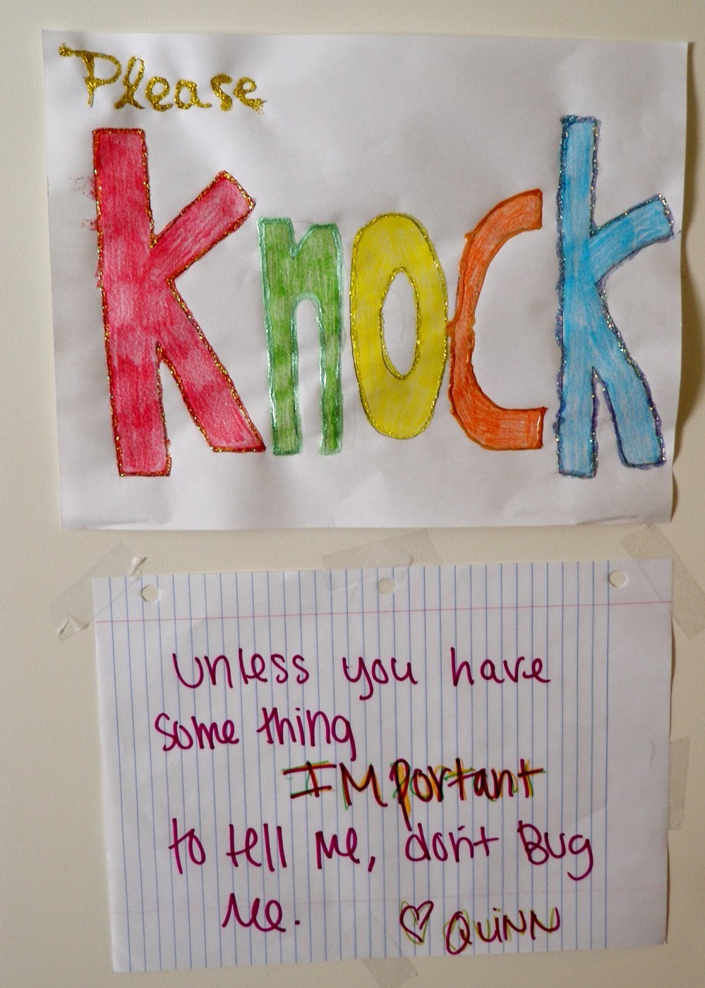 In this house, everyones got a sign on their door. It’s a serious business- your door message- not to be taken lightly or ignored. I have personal experience being reprimanded for not heeding the posted words of warning, no one is above the law here. As of this morning, this is what I found posted: