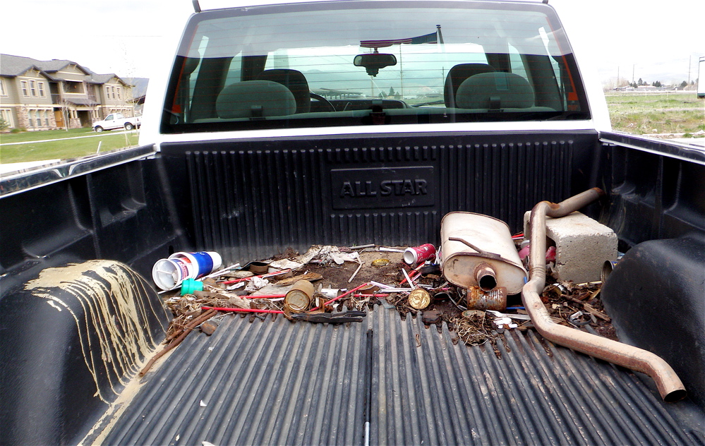 Then I saw this truck bed as I walked across the library parking lot. What is so odd about this pile of crap is that it looks like it’s been there a while, like longer than the truck has been around. The rusted tin cans and matted dirt pile are saying 1953 to me.