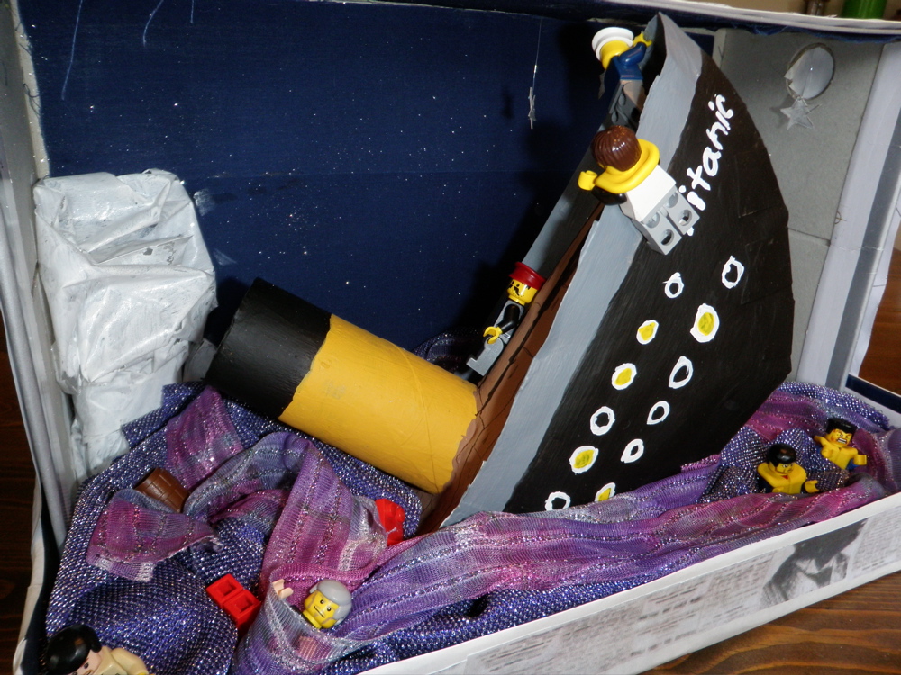 The boat is a cardboard, toilet paper tube, tape, Modge Podge creation that was then painted to resemble the Titanic.