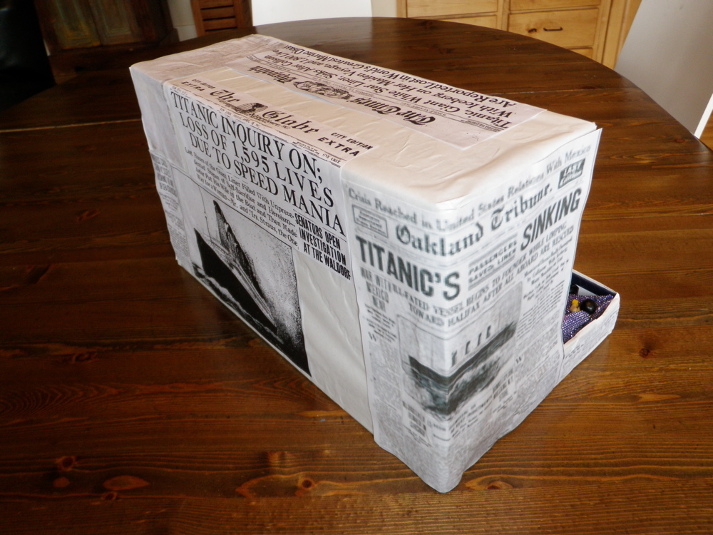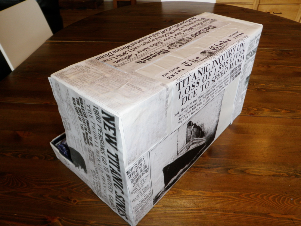 Last minute idea, because it’s all in the details. We printed up the real newspaper articles we found online to cover the outside of the box- thank you internet.