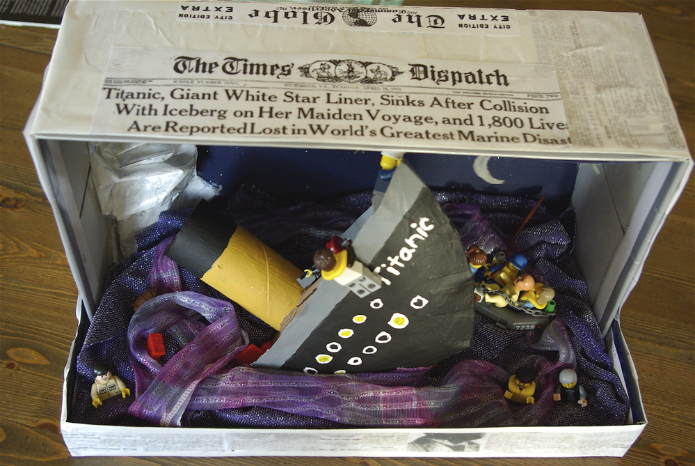 Here’s a great Titanic diorama project idea for a school diorama assignment or just for fun! The book the kids had to read was historical fiction, M picked a book kind of like the American Girl series. I can’t remember the name of the book. It’s about a little orphaned girl who was accompanying a friend to New York to try and find her brother. I think she really enjoyed reading the account of the Titanic sinking, and especially working on this part of the project. Click on any of the pictures to make them bigger.