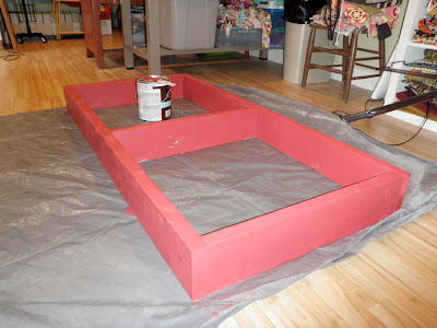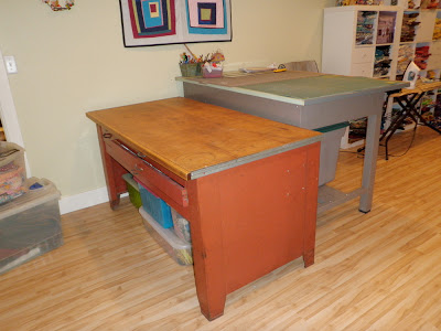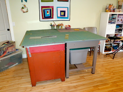 I have these two metal desk that we’ve picked up along the way, back to back in my sewing room. I love the standing/drafting desk. It’s the perfect height for cutting. The red desk is another story- it’s one redeeming quality is the long drawers underneath for poster/big flat paper storage. Since this room has been moved into I’ve wanted to somehow raise up the red desk to standing height and make one big work surface.