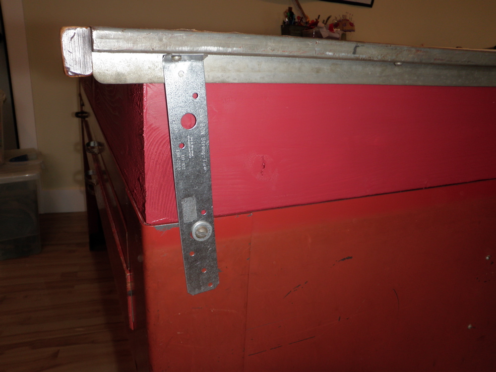 I needed some way to brace the whole contraption to the desk underneath. Hole in the metal were in place already, so I had to work with what already there. I found these metal brackets at Home Depot which actually lined up, with a little bending and turning. Now I just need to paint it red too.
