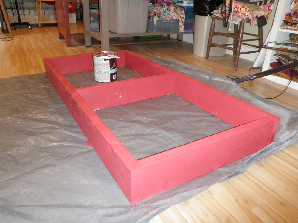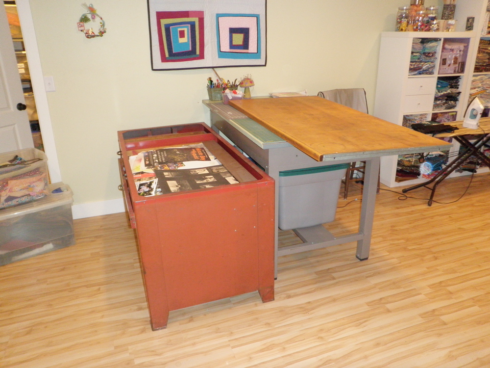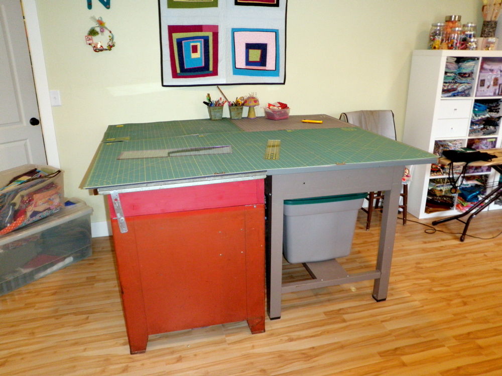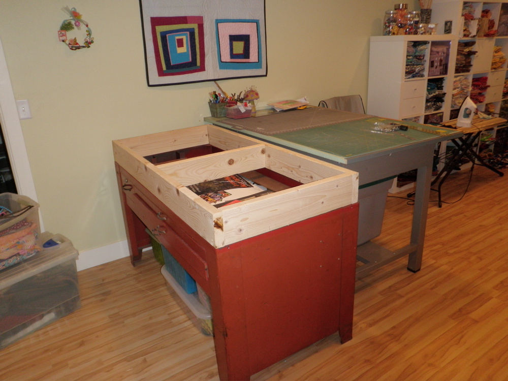 I have these two metal desk that we’ve picked up along the way, back to back in my sewing room. I love the standing/drafting desk. It’s the perfect height for cutting. The red desk is another story- it’s one redeeming quality is the long drawers underneath for poster/big flat paper storage. Since this room has been moved into I’ve wanted to somehow raise up the red desk to standing height and make one big work surface.