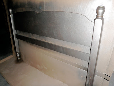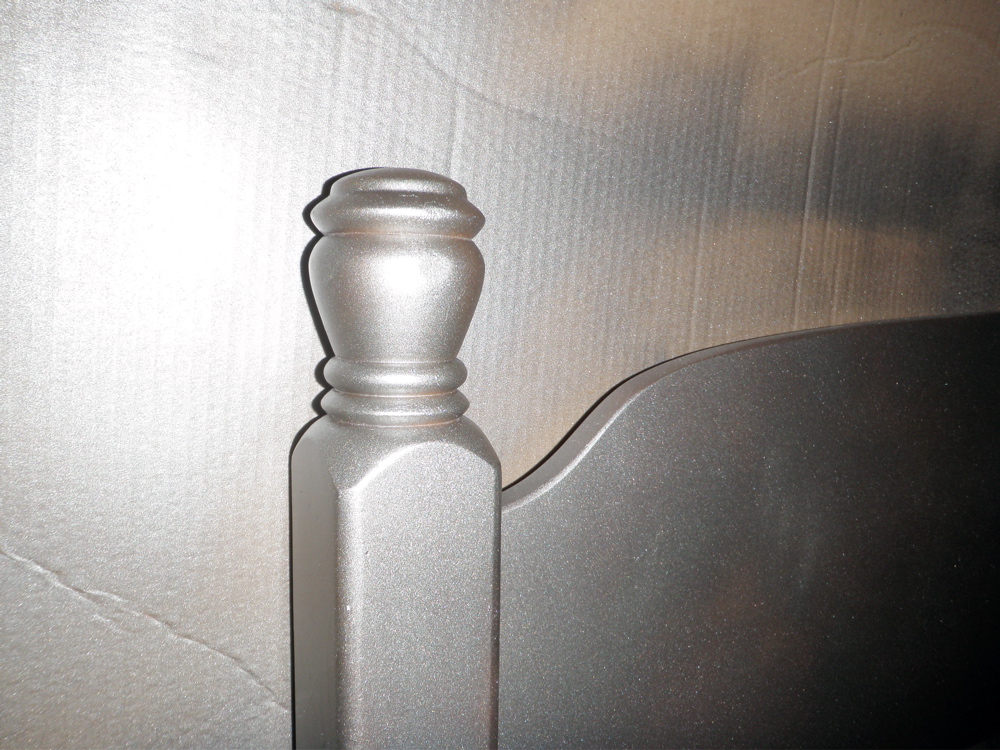 It has been a week of projects- painting this and that, hanging stuff up, searching ksl classifieds for hours… which is where I found this cute little bed for $20. After reading the ad (it said the bed was kind of beat up) I got the silver spray paint and made a plan. But when I picked it up and saw it was, in my opinion, in excellent shape (I guess I have a low threshold for wear and tear on furniture) I changed my mind and set it up with it’s original honey brown color. But alas- no. can. do.- it was way too boring. We dragged it outside and without much to lose, started spraying…