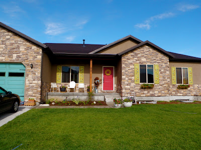 Here they are folks, my folk art flower painted shutters- in all their colorful glory, with their corresponding front and garage door. I got all crazy today and got my planters chocked full of annuals and the front flower bed planted with my favorite perennials and a few herbs too. Let’s not forget what I think is now my favorite part- the window boxes.