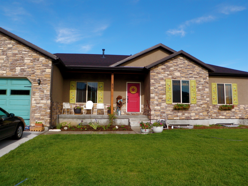 Here they are folks, my folk art flower painted shutters- in all their colorful glory, with their corresponding front and garage door. I got all crazy today and got my planters chocked full of annuals and the front flower bed planted with my favorite perennials and a few herbs too. Let’s not forget what I think is now my favorite part- the window boxes.